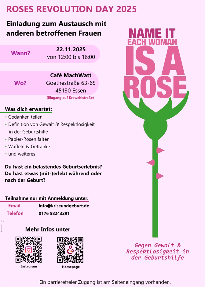 Gewalt und Respektlosigkeit unter der Geburt hinterlassen Spuren, die viele Frauen lange begleiten. Der Roses Revolution Day macht diese Erfahrungen sichtbar und schenkt Betroffenen einen Ort, an dem sie sich verstanden fühlen dürfen – ohne Rechtfertigung, ohne Tabu, ohne Bewertung.